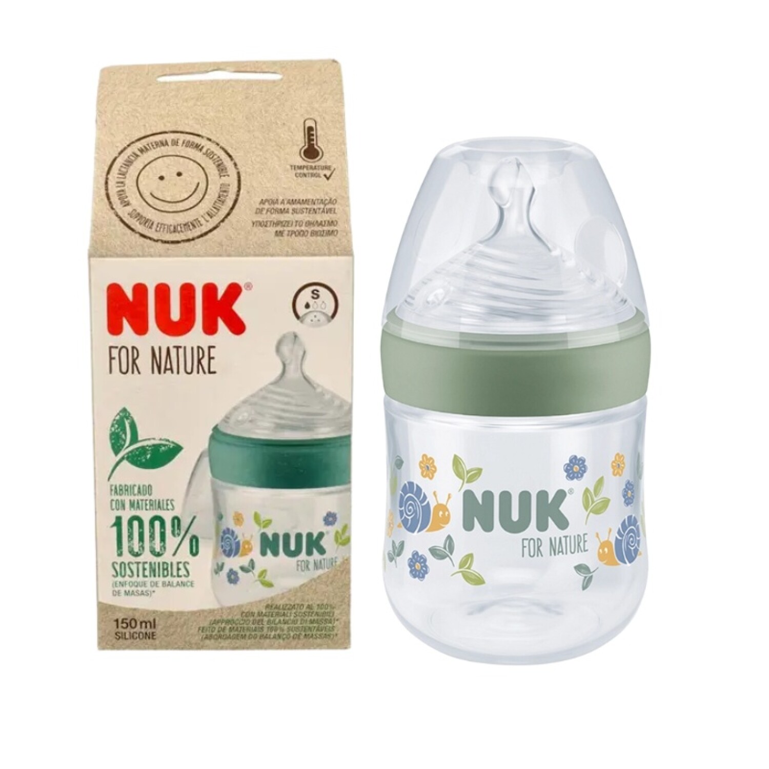 Biberón de la línea NUK for Nature, con capacidad de 150 ml y tetina de silicona suave, diseñado para imitar la forma natural del pezón materno y facilitar la transición al bebé. Ideal para alimentación diaria, fácil de agarrar y cómodo tanto para el bebé como para los padres.
