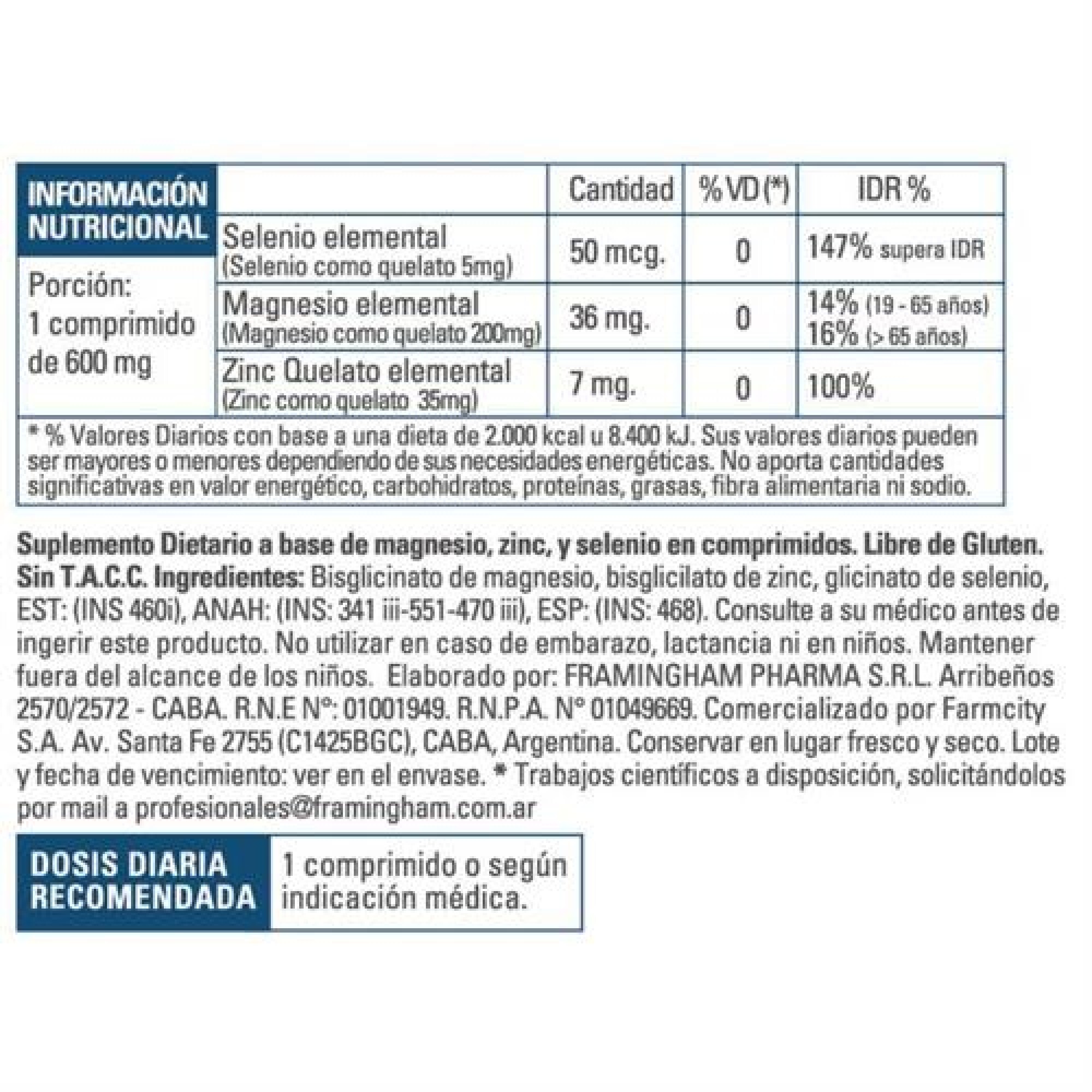 Suplemento nutricional formulado con minerales esenciales en forma quelatada, lo que mejora su absorción y biodisponibilidad, facilitando su aprovechamiento por el organismo y reduciendo el riesgo de molestias digestivas. La combinación de Zinc, Magnesio y Selenio contribuye al funcionamiento normal del sistema inmunológico, muscular y nervioso, además de brindar acción antioxidante.